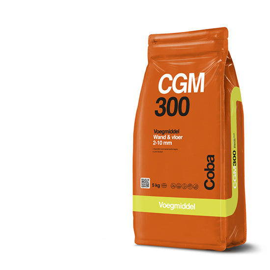 Voeg 5 kg Coba voegmiddel CGM300 toe aan ca. 1,1 liter schoon leidingwater. Voeg bij een zak van 20 kg ca. 4,2 liter schoon leidingwater toe. Gebruik een schone en droge speciekuip of emmer. Meng 1 minuut intensief met een geschikte mortelmixer tot een homogene, klontvrije massa is ontstaan. Na enkele minuten nogmaals mengen. Coba voegmiddel CGM300 aanbrengen met een voegrubber of voegenspaan zodat de voegen geheel gevuld zijn. Afhankelijk van de zuiging van de ondergrond en tegel, dient een wachttijd in acht genomen te worden om het voegmiddel op te laten stijven in de voeg. De voegen nasponzen met een sponsbord op het moment dat de voeg niet meer kleeft aan de vinger. Hierbij spaarzaam water gebruiken en plasvorming in de voeg voorkomen, dit voorkomt kleurverschil. Na het afsponzen de voegen in de lengterichting nastrijken met een schone uitgewrongen spons, dit geeft de voeg zijn uiteindelijke oppervlaktetextuur. Verwerk aangemaakt voegmiddel altijd binnen 60 minuten. Verwerkingstemperatuur tussen 5°C en 25°C. Zet bij twijfel altijd een proefstuk op of neem contact op met onze afdeling technische adviezen. Reinig gereedschap direct na gebruik met (warm) water.